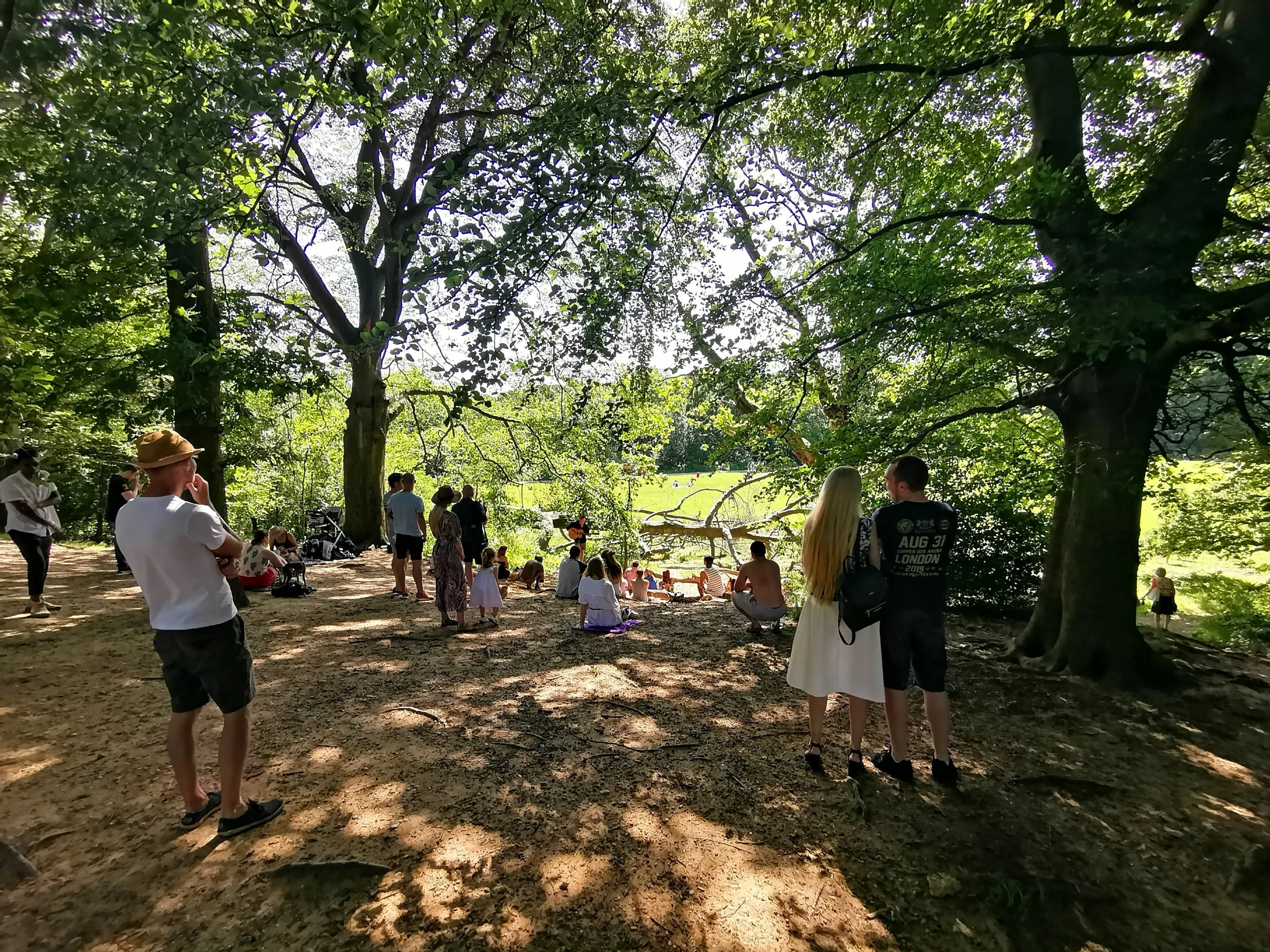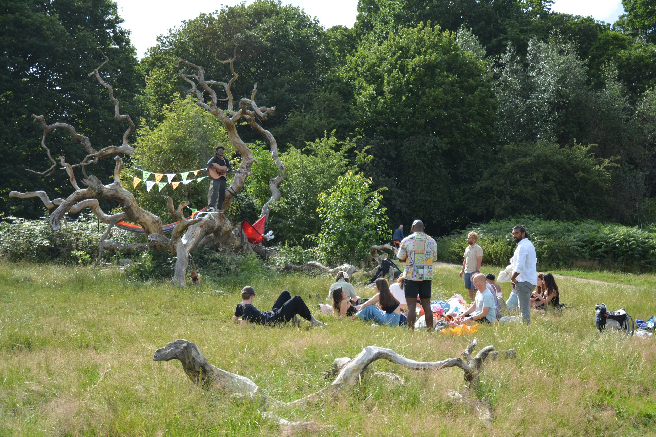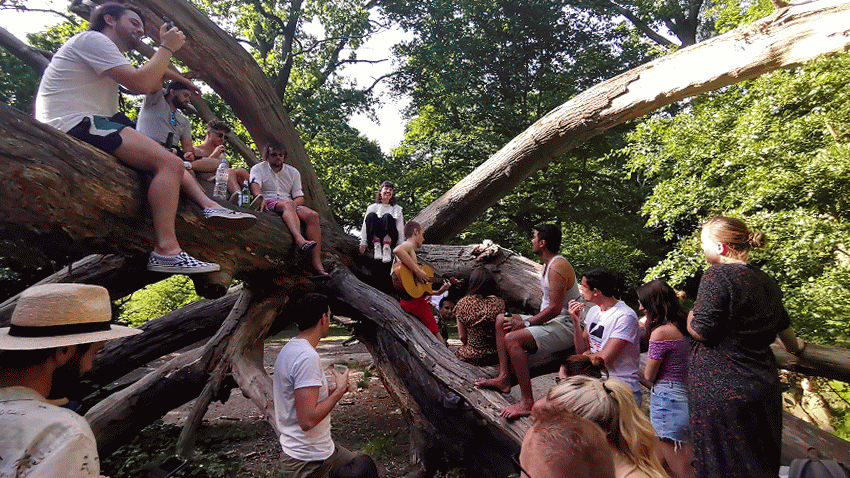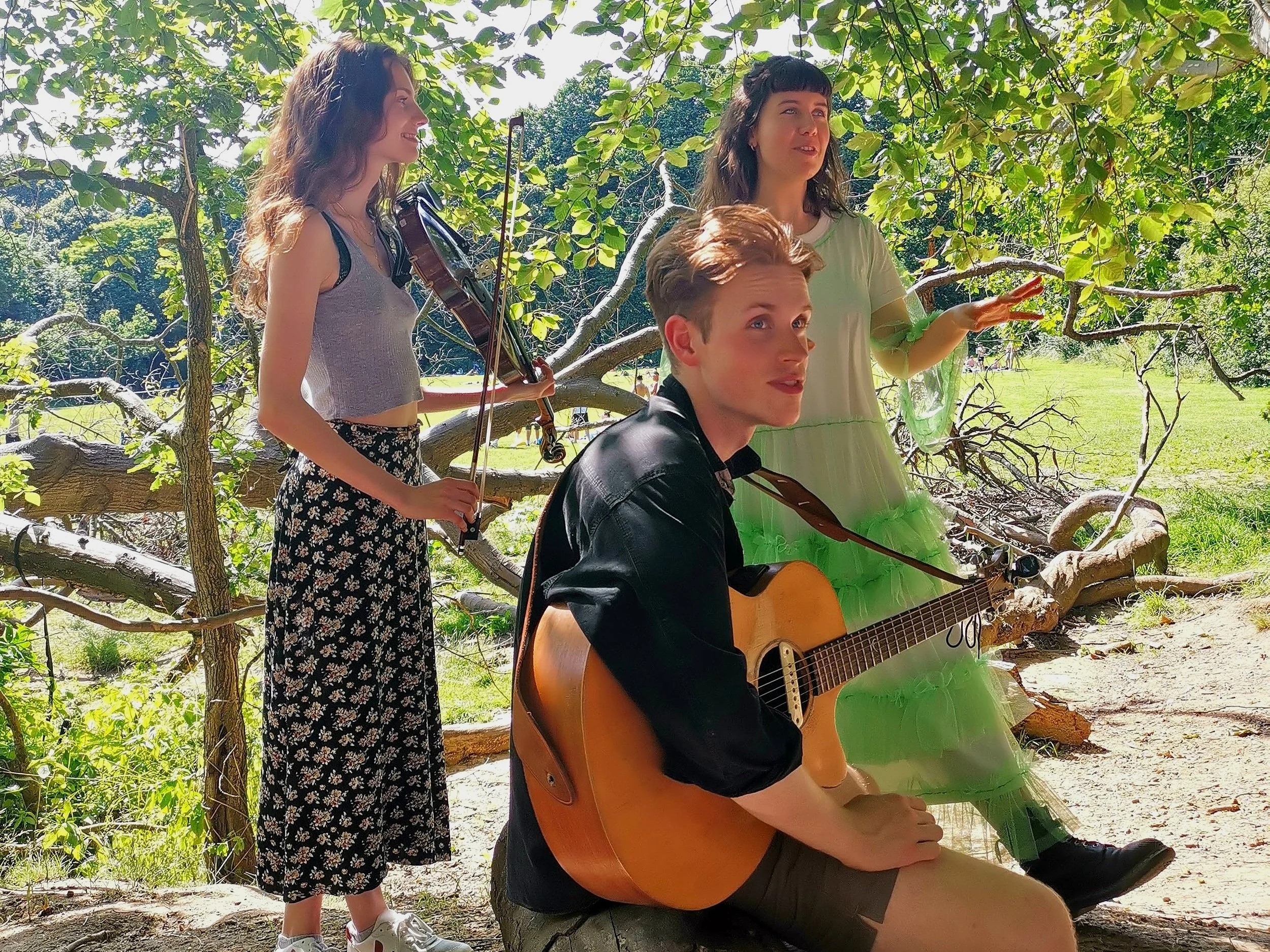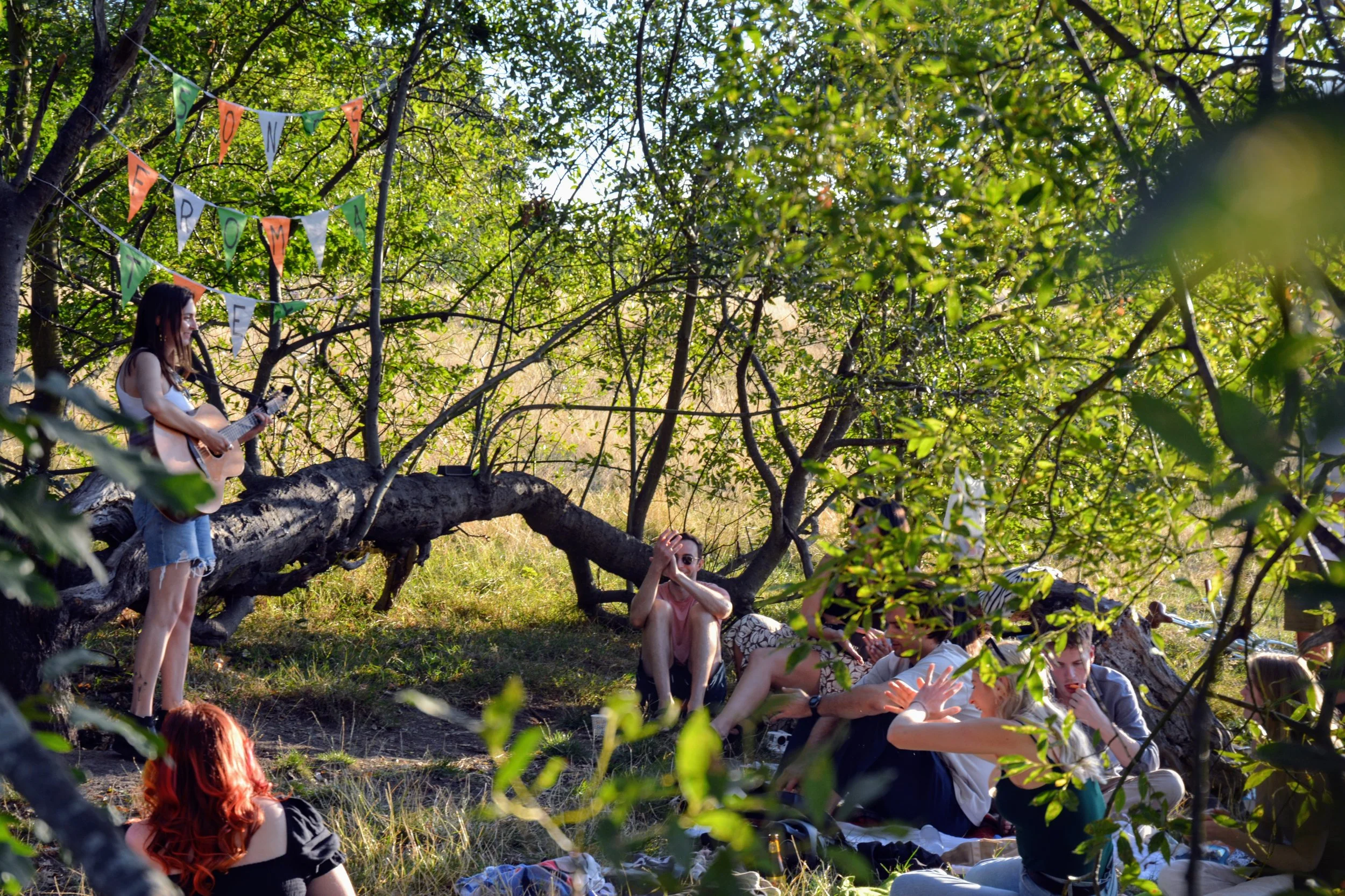 Whether it be utter strangers who stop by for a song as they walk their dog or a kid climbs the tree for a better view, something special always unfolds at these gatherings. More than once we have had friends walk by not knowing it was happening and grace us with an entire set of songs. The fun lies predominantly in that there is no barrier to entry — no ticket, no stage, no rules.