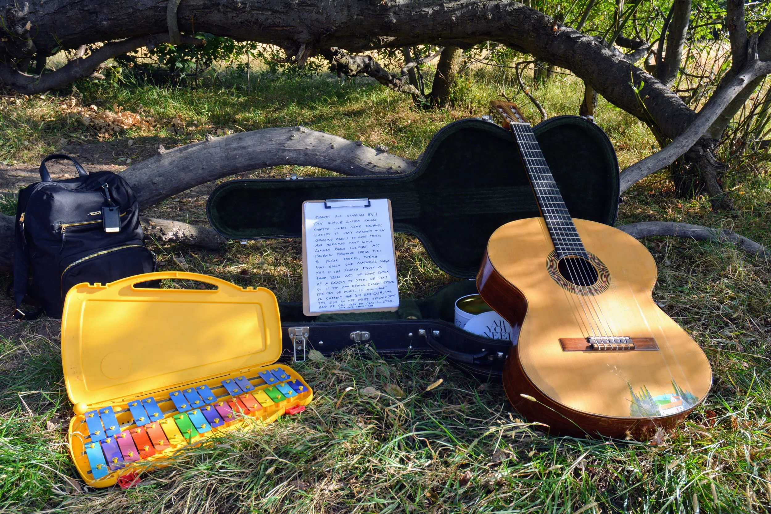 There are no rules. All we have ever done was invite a few musicians to gather for an all acoustic play around in the park. We stock up on park snacks and chose a tree, then proceeded to set out some instrument cases and simply start playing.